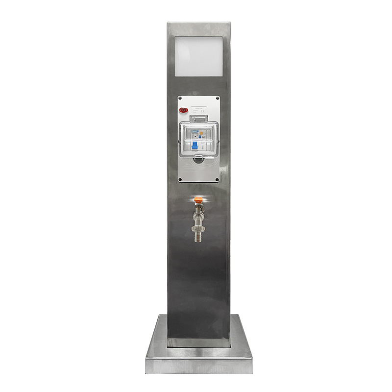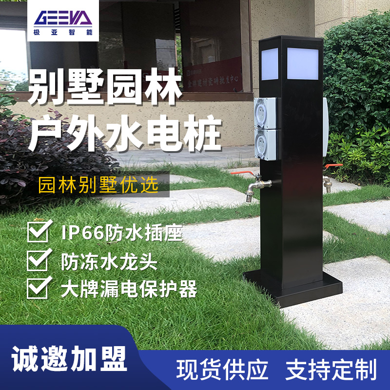 庭院帶燈水電樁GRWE801515D-R系列水電樁,IP66防護標準,無懼風雨沙塵,長久穩定運行。配備漏電保護器,智能三合一防護,漏電0.1秒斷電。PC硅膠燈板加持,歐普LED更耐用,光照持久穩定。